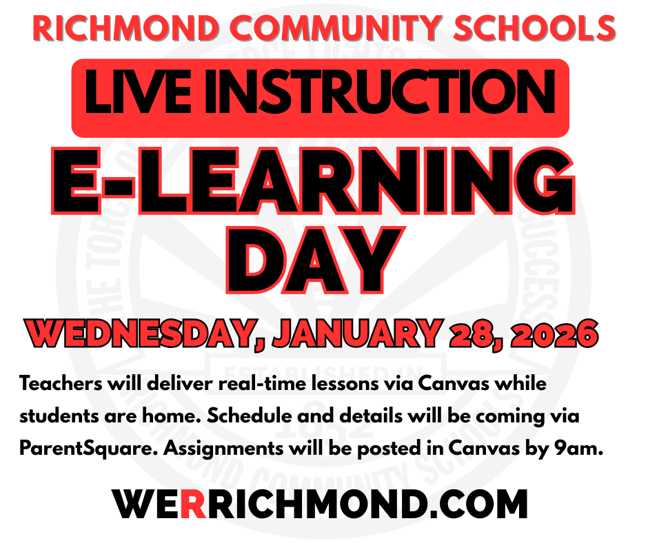 RCS will have a live instruction eLearning Day on Wed, Jan 28, 2026. Teachers will deliver real-time lessons via Canvas while students are home. Schedule and details will be coming via ParentSquare. Assignments will be posted in Canvas by 9am. Head Start Richmond is closed.